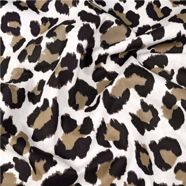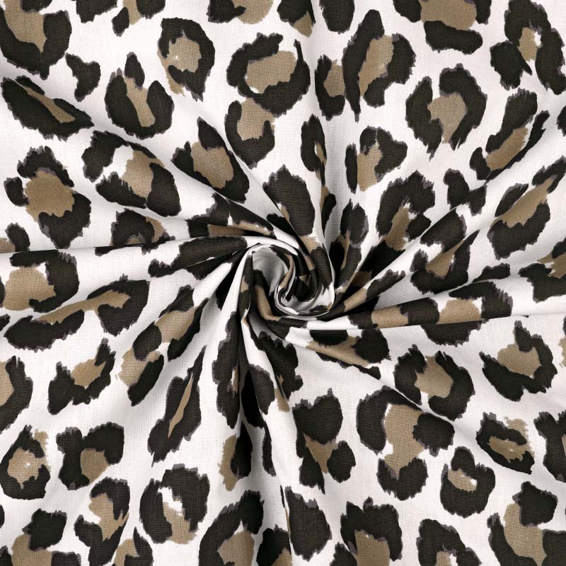 En tunn och följsam Bomullspoplin i 100% bomull! Tyget har ett tryckt leopardmönster på rätsidan. Bomullstyget är tätvävt och helt i naturmaterial vilket gör att tyget andas och känns skönt och luftigt. Passar utmärkt till sömnad av lapptäcken, blusar, skjortor, klänningar, sängkläder och mycket mer!