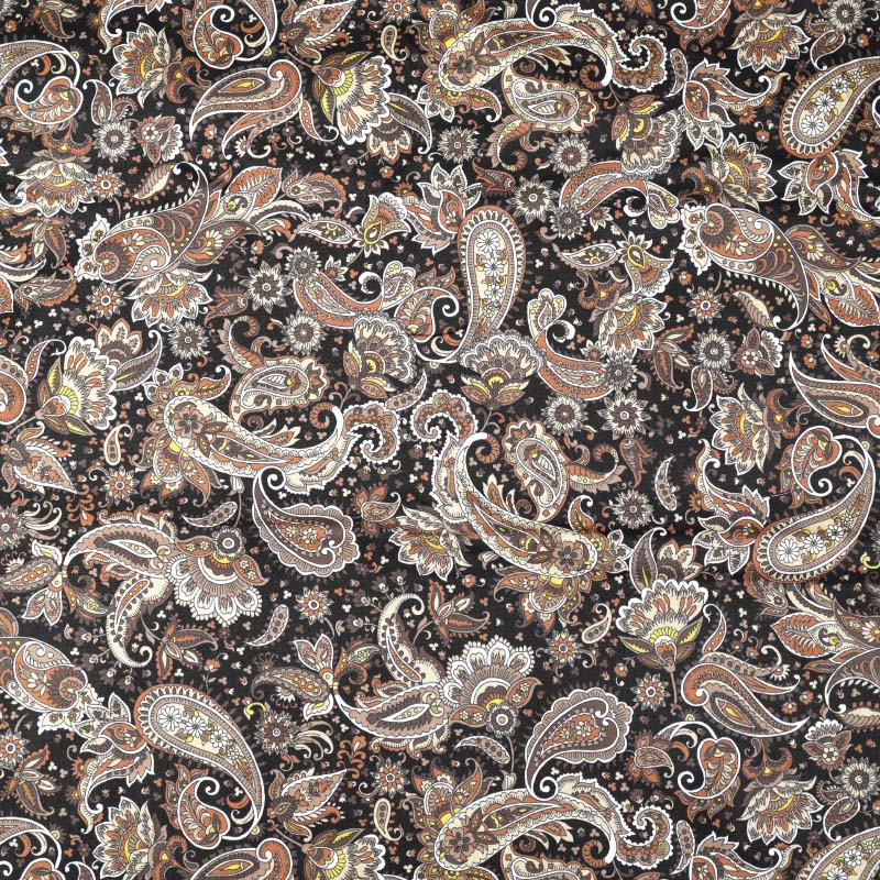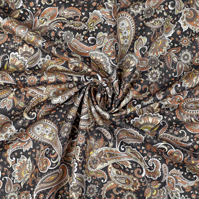En tunn och följsam Bomullspoplin i 100% bomull! Tyget har ett tryckt paisleymönster på rätsidan. Bomullstyget är tätvävt och helt i naturmaterial vilket gör att tyget andas och känns skönt och luftigt. Passar utmärkt till sömnad av lapptäcken, blusar, skjortor, klänningar, sängkläder och mycket mer!