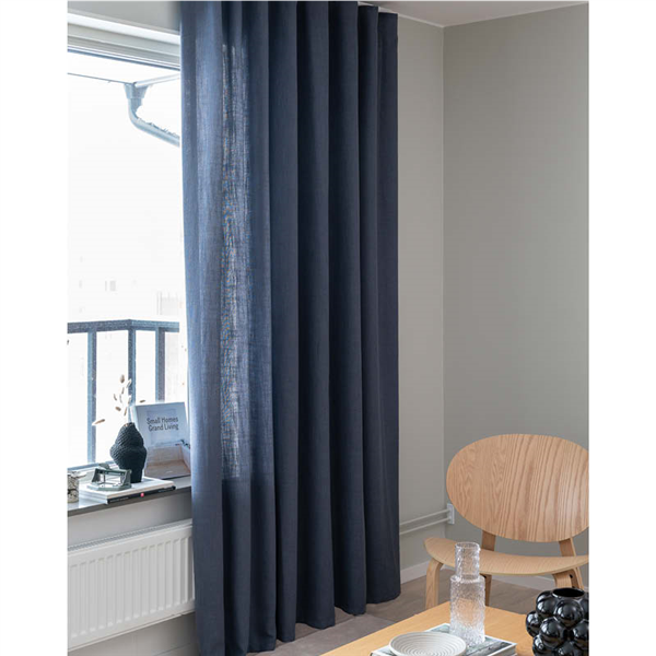 Det tätt vävda tyget i lyxig linnelook ger ett exklusivt och naturligt uttryck, och släpper in ljuset på ett mjukt och dämpat vis. Den tunga kvaliteten gör att gardinen faller mjukt och elegant, vilket ger rummet en varm och ombonad atmosfär.