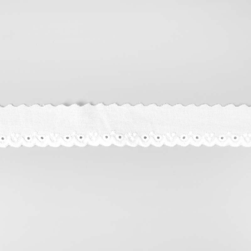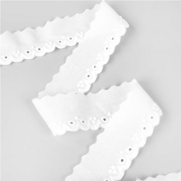Dekorativt Brodyrband i 100% bomull. Brodyren har en vågig kant med brodyr på ena och enkel vågig kant på andra. Används både till klädsömnader som till inredningsprojekt! Bandet är tunt och följsamt.