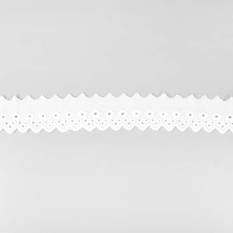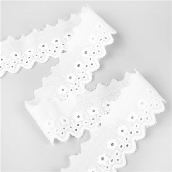 Dekorativt Brodyrband i 100% bomull. Brodyren har en vågig kant med brodyr på ena och enkel vågig kant på andra. Används både till klädsömnader som till inredningsprojekt! Bandet är tunt och följsamt.