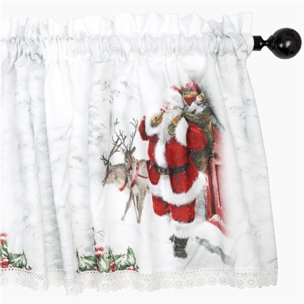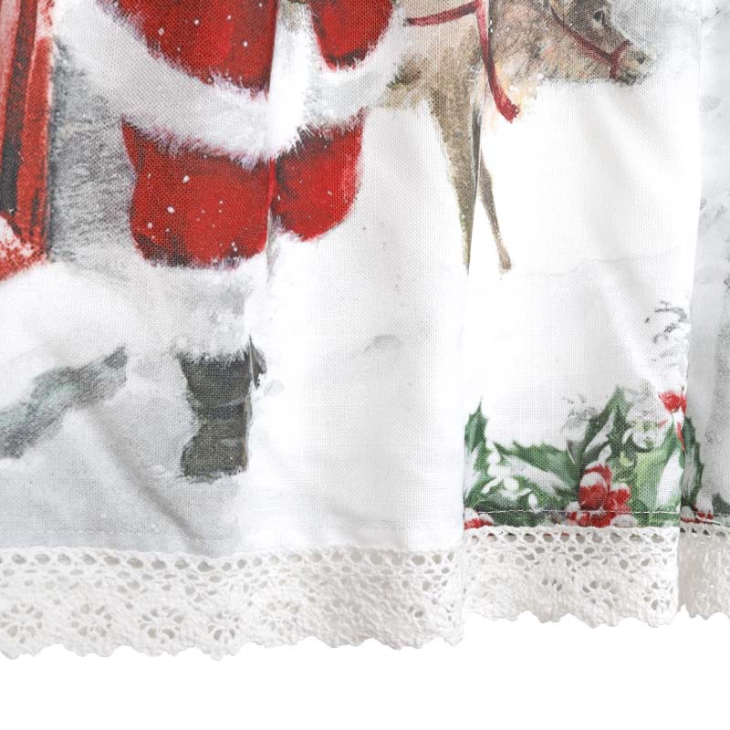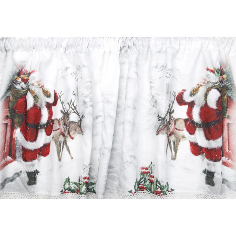 En fin gardinkappa på metervara med juligt motiv! Gardinkappan är 45cm i höjd och har en färdigsydd kanal upptill. Nedre kanten är fållad och har ett vackert, dekorativt spetsband fastsytt (se bild 2). Klipp i önskad längd och fålla enkelt sidorna! Eller beställ Kappfållning hos oss - då fållar vi sidorna åt dig!