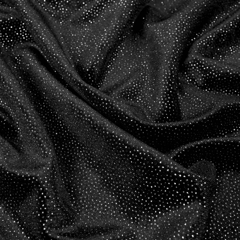 Ett stretchigt och otroligt lyxigt Modetyg med invävda glittertrådar som skapar ett vackert skimmer och djup. Trikåtyget har en mjuk och följsam känsla, med ett tungt, naturligt fall. Rätsidan har en mjuk sammetsliknande yta medan avigsidan är slät och känns behaglig mot huden. Tyget passar perfekt till sömnad av klänningar, blusar, byxor, kavajer, kjolar och andra festliga plagg!