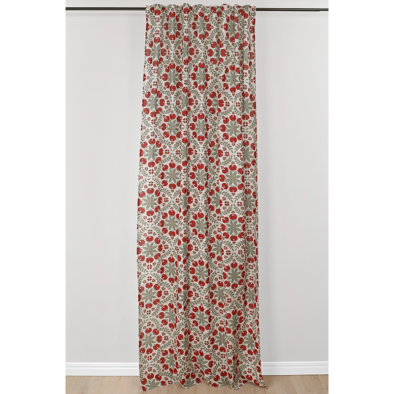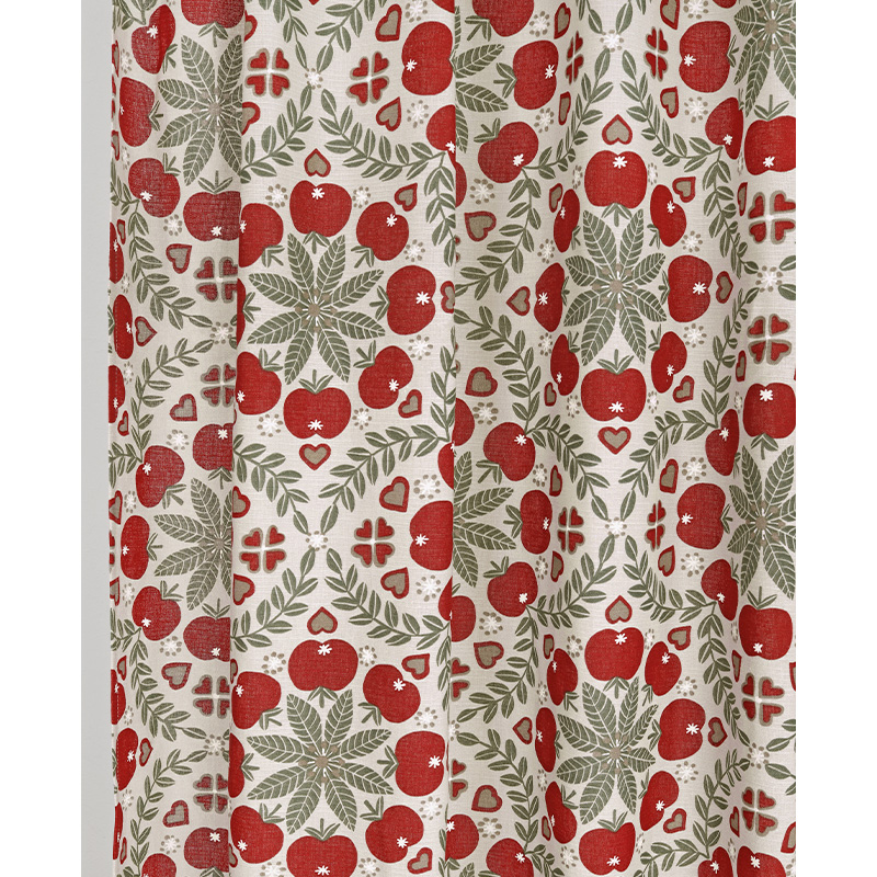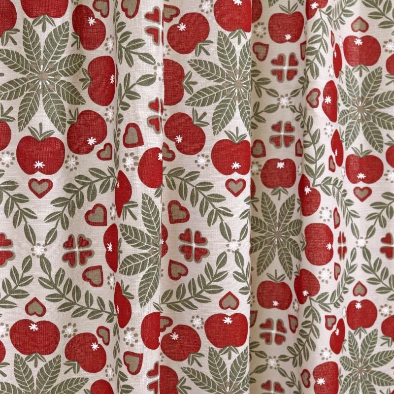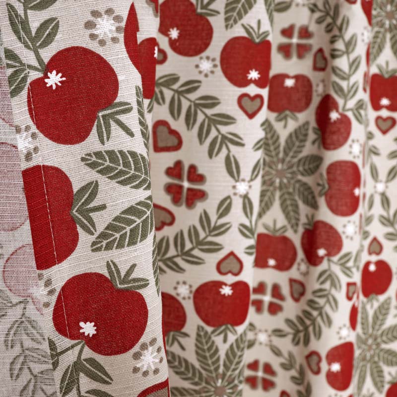 Gardin Juläpple (2-pack) ger en vacker och stämningsfull detalj till i rummet! En Gardin i 100% bomull med ett mjukt, lätt fall mot golvet och en vacker linnelook kvalité samt overlock nertill. Gardinen har ett vacker tryckt mönster designat av en svensk designer och finns även som färdigsydda Gardinkappor.