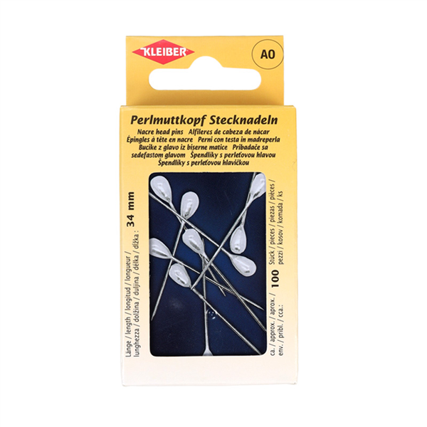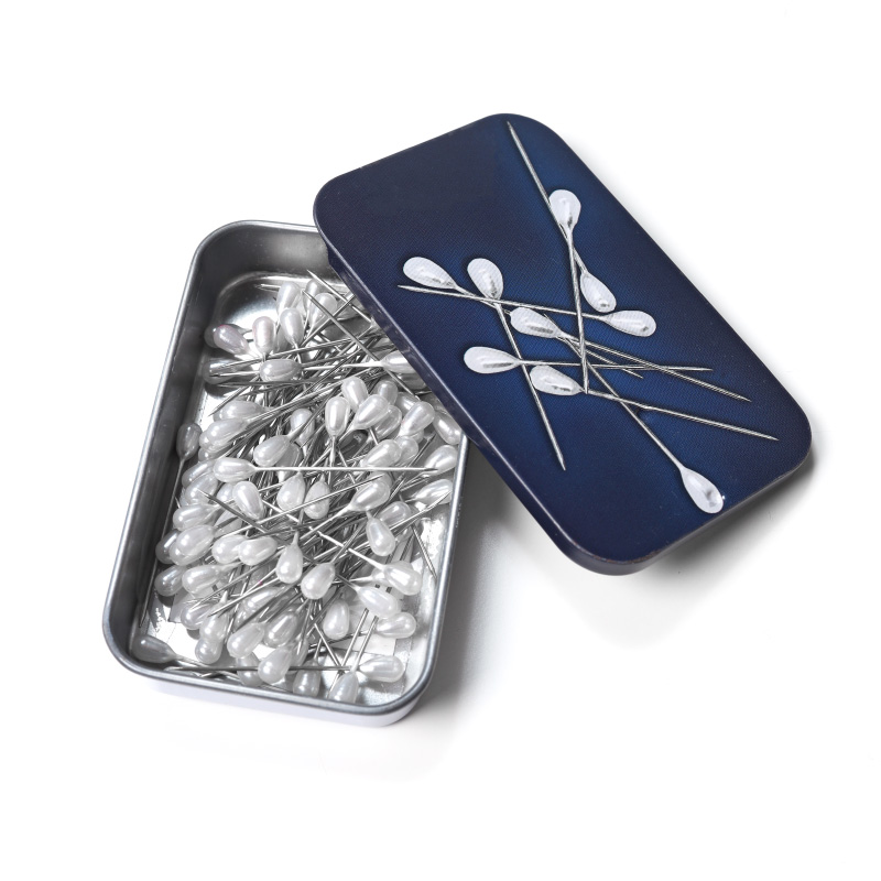 Knappnålar med oregelbundna pärlemorknoppar i vitt, 34mm, i en fin metallask. I lådan är det ungefär ca 100st nålar i rostfritt stål.