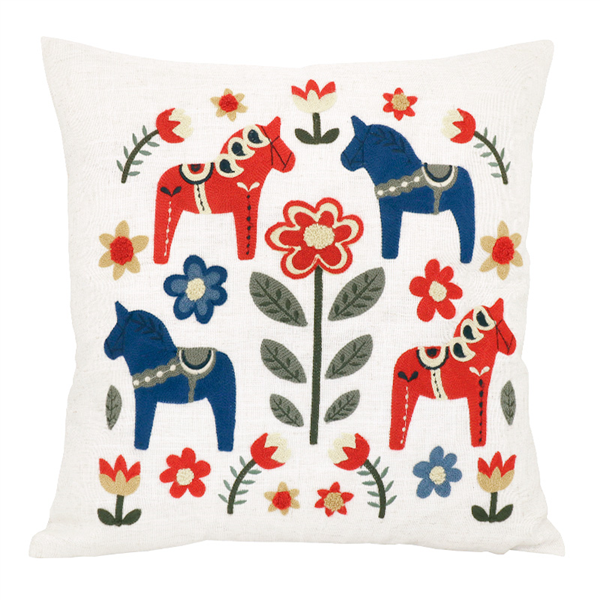 Vackert Kuddfodral med broderade blommor och dalahästar på vävd kvalité i linnemix. Mönstret återges enbart på framsidan, medan baksidan är enfärgad. Försluts smidigt med dolt blixtlås längs fodralets nedre kant.