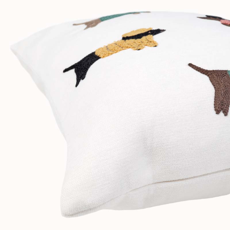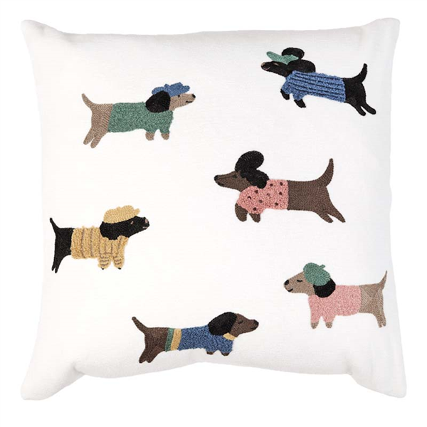 Vackert kuddfodral med broderat mönster av fina hunda på len och mjuk chenille. Mönstret återges enbart på framsidan, medan baksidan är enfärgad i samma mjuka kvalité. Försluts smidigt med dolt blixtlås längs fodralets nedre kant.