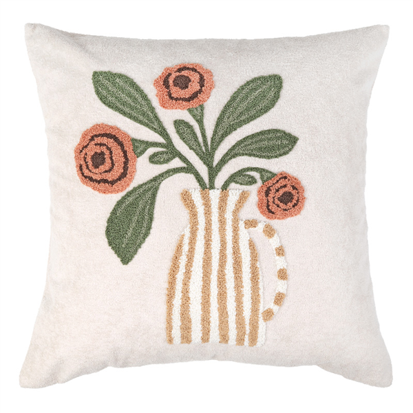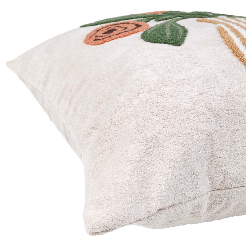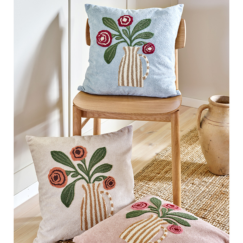 Vackert kuddfodral med broderat blommönster i mjuk kortklippt teddy-kvalité. Mönstret återges enbart på framsidan, medan baksidan är enfärgad. Försluts smidigt med dolt blixtlås längs fodralets nedre kant.