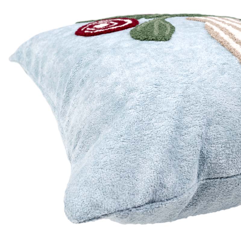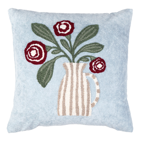 Vackert kuddfodral med broderat blommönster i mjuk kortklippt teddy-kvalité. Mönstret återges enbart på framsidan, medan baksidan är enfärgad. Försluts smidigt med dolt blixtlås längs fodralets nedre kant.