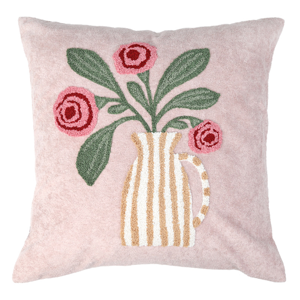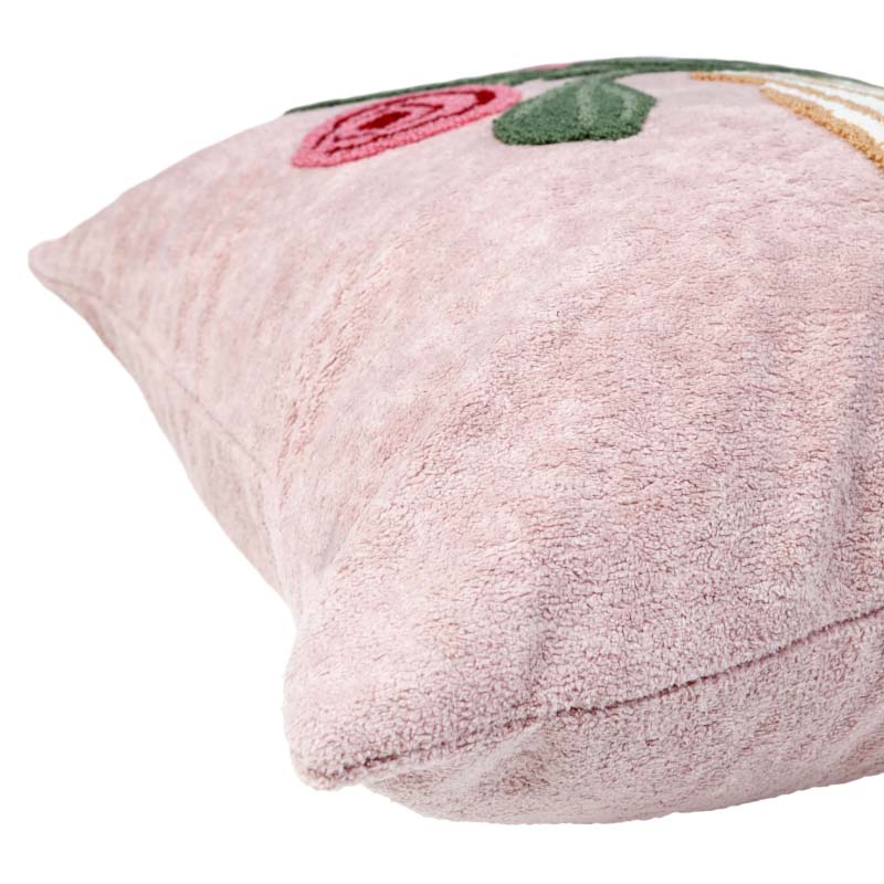 Vackert kuddfodral med broderat blommönster i mjuk kortklippt teddy-kvalité. Mönstret återges enbart på framsidan, medan baksidan är enfärgad. Försluts smidigt med dolt blixtlås längs fodralets nedre kant.