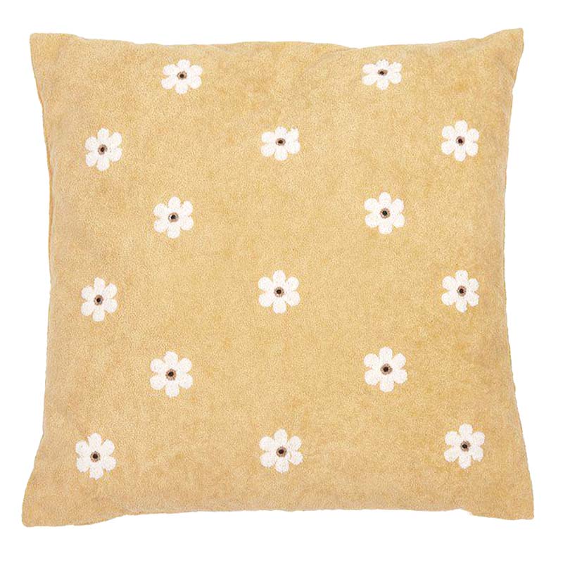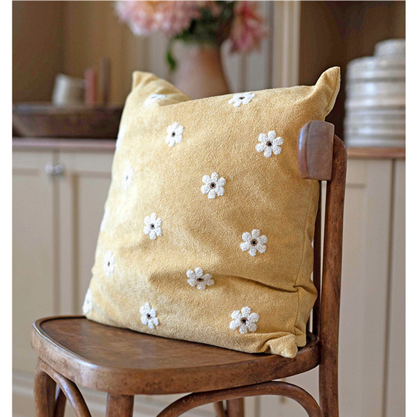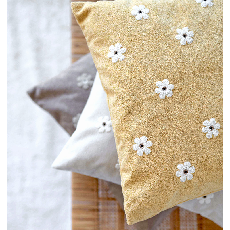 Vackert kuddfodral med tuftat mönster av små blommor i mjuk kortklippt teddy-kvalité. Mönstret återges enbart på framsidan, medan baksidan är enfärgad i samma mjuka kvalitet. Försluts smidigt med dolt blixtlås längs fodralets nedre kant.