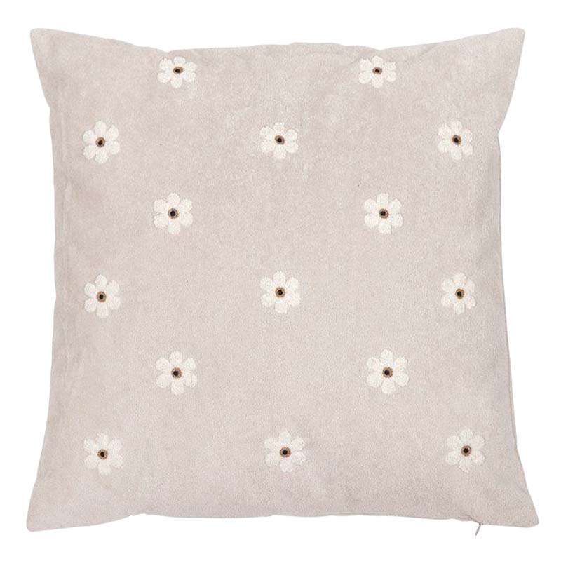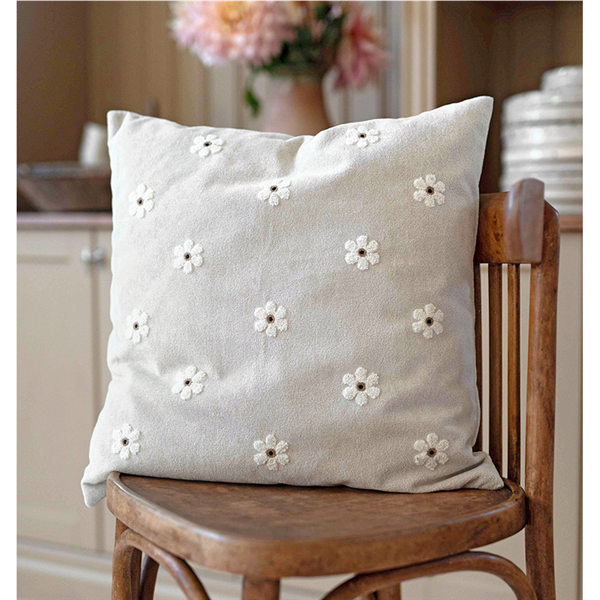 Vackert kuddfodral med tuftat mönster av små blommor i mjuk kortklippt teddy-kvalité. Mönstret återges enbart på framsidan, medan baksidan är enfärgad i samma mjuka kvalitet. Försluts smidigt med dolt blixtlås längs fodralets nedre kant.