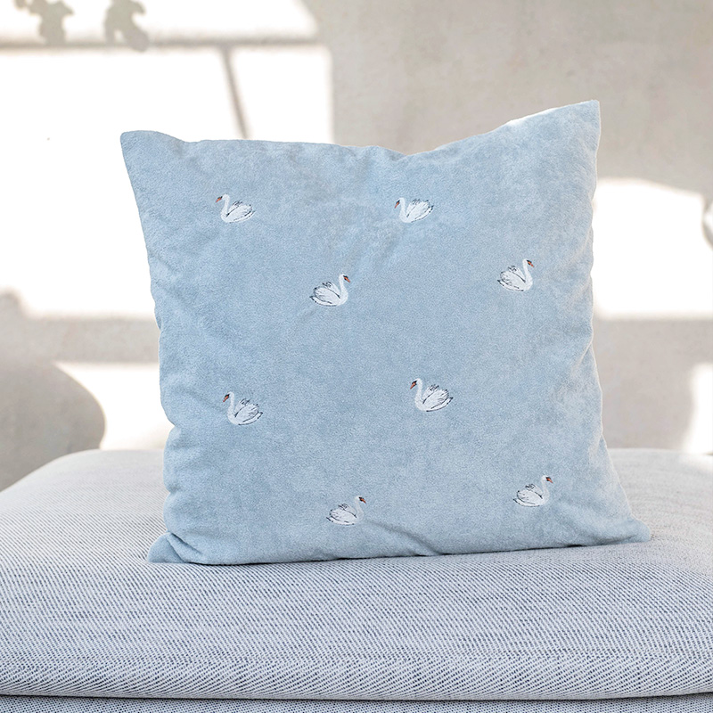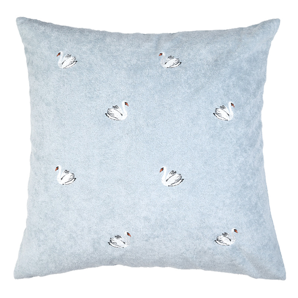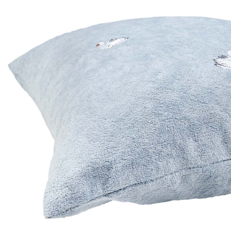 Vackert kuddfodral med broderat motiv av svanar i mjuk kortklippt teddy-kvalité. Mönstret återges enbart på framsidan, medan baksidan är enfärgad i samma mjuka kvalitet. Försluts smidigt med dolt blixtlås längs fodralets nedre kant.