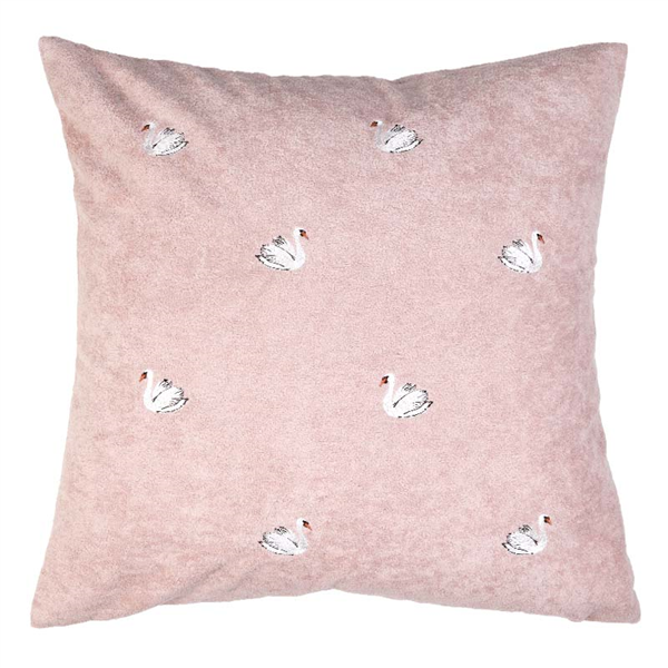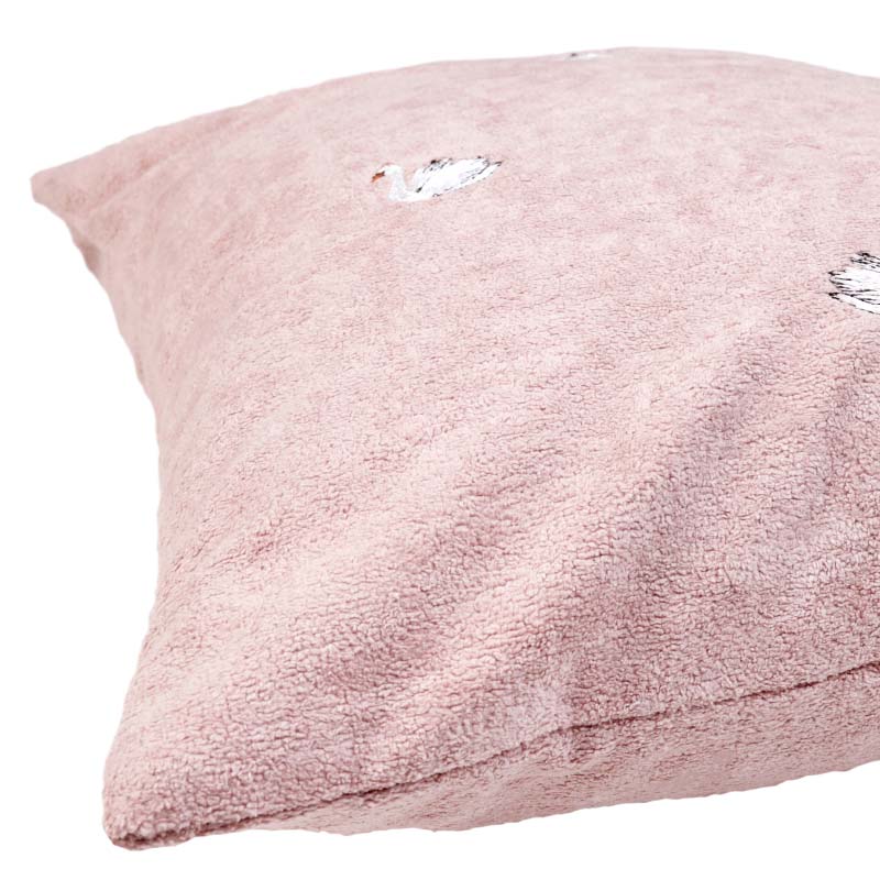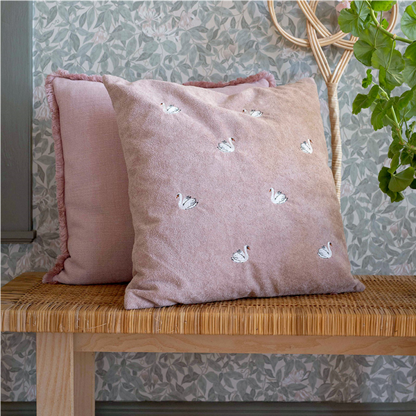 Vackert kuddfodral med broderat motiv av svanar i mjuk kortklippt teddy-kvalité. Mönstret återges enbart på framsidan, medan baksidan är enfärgad i samma mjuka kvalitet. Försluts smidigt med dolt blixtlås längs fodralets nedre kant.