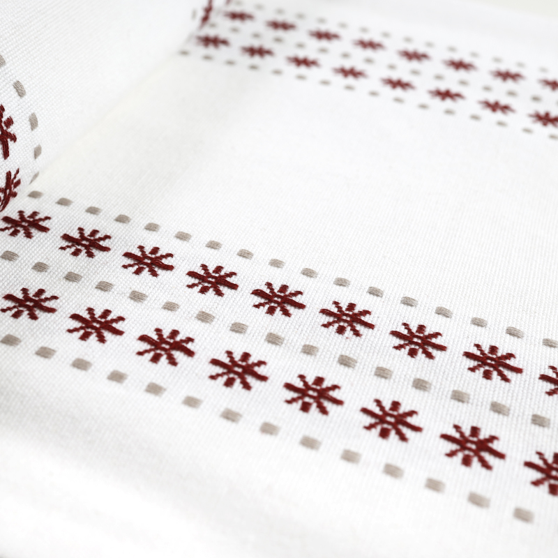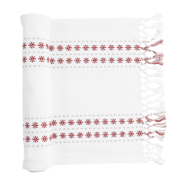 Duka fint med David bordslöpare i 100% bomull, med härlig textur, vävt mönster och franskant. Duken har dekorativa fransar på båda kortsidorna och har vävda ränder av streck och blommor utefter längden på löparen. Mönstret återges inte på baksidan.