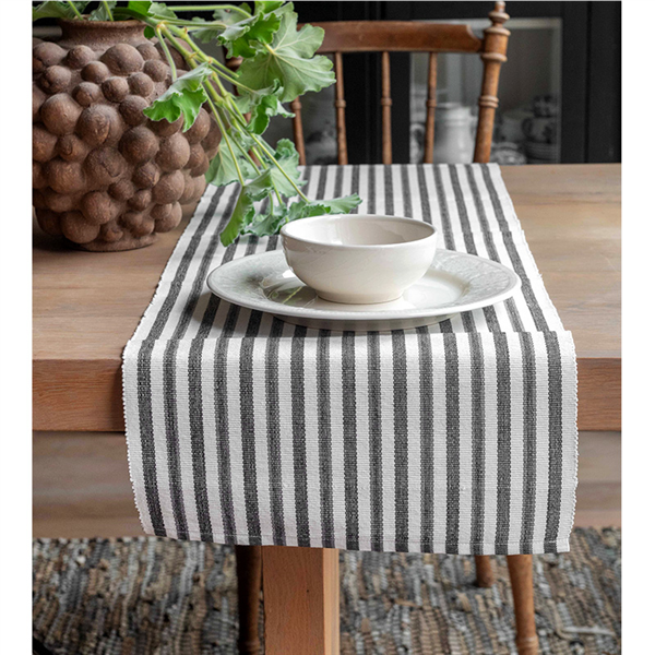 Duka fint med Bordslöpare Nina, en ribbad löpare med ett klassiskt randigt mönster i 100% bomull! Löparen har en tätt vävd struktur med fållade sidor. Löparens mått är 35x120cm.