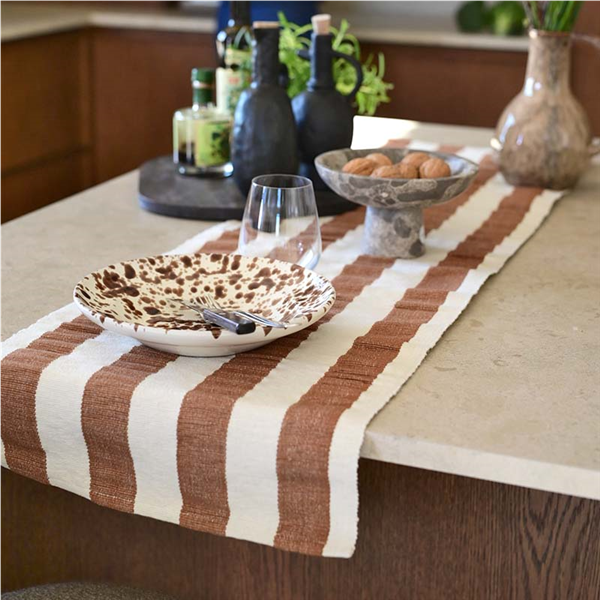 Duka fint med Bordslöpare Stig i 100% bomull, med härlig textur och vävt, randigt mönster. Duken är fållad på båda kortsidorna och har en vävd randigt struktur. I och med att löparen är vävd i bomull, är den mjuk och lägger sig fint på bordet!