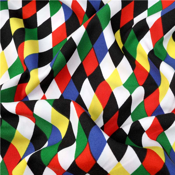 En mönstrad Modepolyester, även känd som Bi-stretch, med tungt och följsamt fall. Det har en vacker lyster och den glatta ytan gör tyget lätt att arbeta med, vilket uppskattas både av nybörjare och erfarna sömnadsentusiaster. Bi-stretch menas att tyget är ett vävt tyg med mekanisk stretch åt båda hållen. Däremot innehåller inte tyget någon stretchtråd så den upplevs stumt och fast.