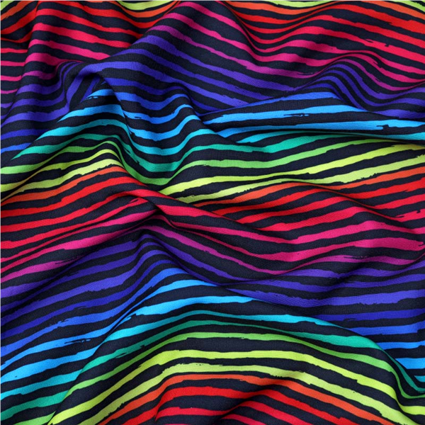 En mönstrad Modepolyester, även känd som Bi-stretch, med tungt och följsamt fall. Det har en vacker lyster och den glatta ytan gör tyget lätt att arbeta med, vilket uppskattas både av nybörjare och erfarna sömnadsentusiaster. Bi-stretch menas att tyget är ett vävt tyg med mekanisk stretch åt båda hållen. Däremot innehåller inte tyget någon stretchtråd så den upplevs stumt och fast.