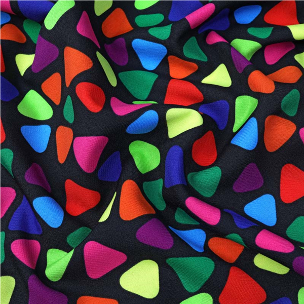 En mönstrad Modepolyester, även känd som Bi-stretch, med tungt och följsamt fall. Det har en vacker lyster och den glatta ytan gör tyget lätt att arbeta med, vilket uppskattas både av nybörjare och erfarna sömnadsentusiaster. Bi-stretch menas att tyget är ett vävt tyg med mekanisk stretch åt båda hållen. Däremot innehåller inte tyget någon stretchtråd så den upplevs stumt och fast.