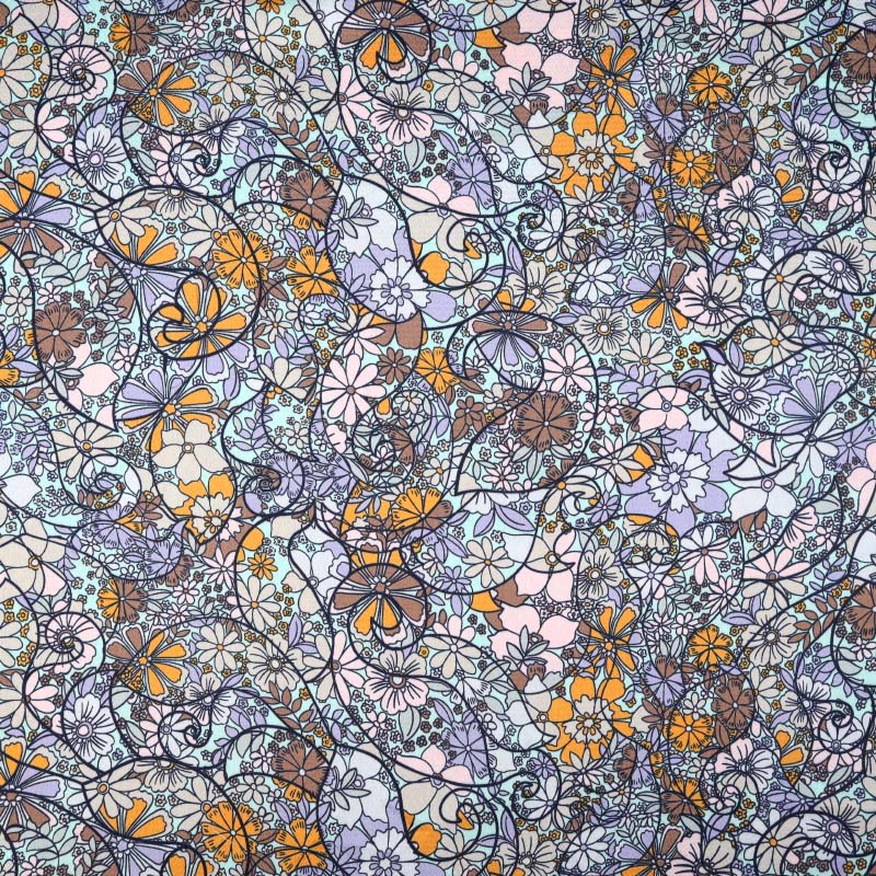 Ett tunt Modetyg med ett tryckt vackert mönster. Klädtyget upplevs otroligt böljande, tunt och följsamt. Tyget har en lätt kreppad yta och ett diskret skimmer. Passar perfekt till sömnad av blusar, klänningar, skjortor, kjolar, byxor med mera.
