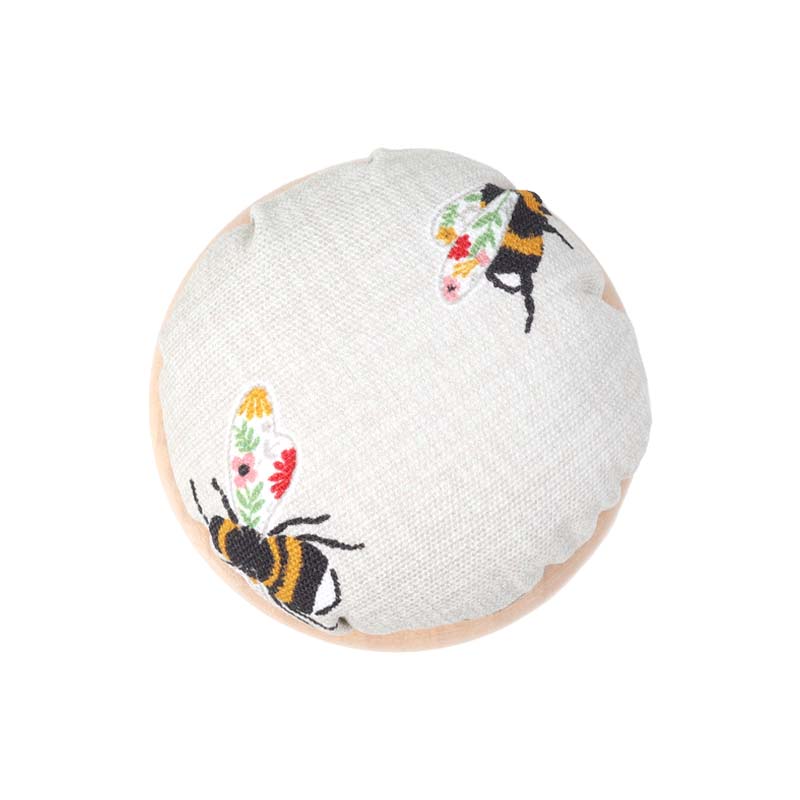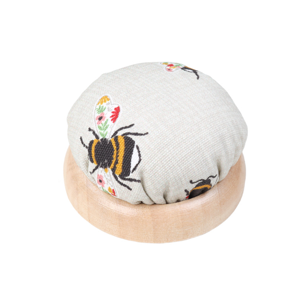 En fin och praktisk nåldyna för alla dina sömnadsprojekt! Nåldynan är klädd i ett mjukt och gulligt bomullstyg och står stadigt på en botten i trä, ett perfekt tillskott att ha i syskrinet.