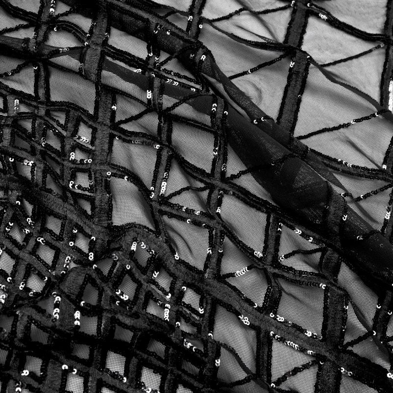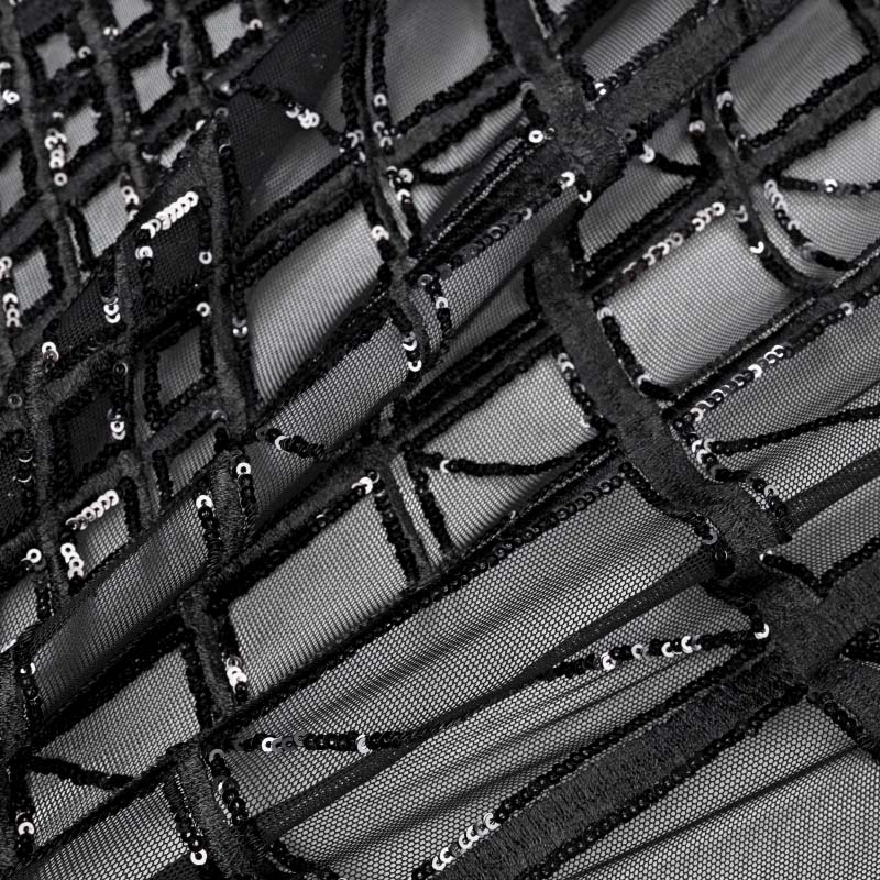 Ett tunt Meshtyg med små fastsydda paljetter som ger tyget ett festligt och skimrande intryck! Tyget har en lätt och följsam känsla med generös stretch. Tyget är transparent och passar därför särskilt bra i kombination med andra tyger och i flera lager. Passar utmärkt till att sy festliga plagg såsom skjortor, kjolar, blusar, klänningar, kavajer, byxor och mycket mer!
