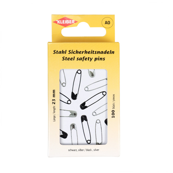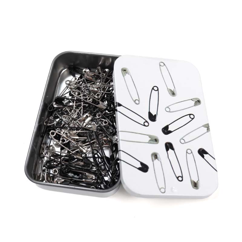 Säkerhetsnålar i praktisk metallask. En förpackning innehåller cm 100st Säkerhetsnålar med en längd på 23mm.