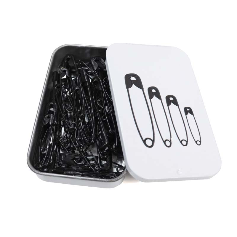 Säkerhetsnålar i 4 olika storlekar i praktisk metallask.