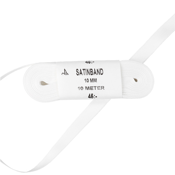 Tio meter glansigt Satinband med bredd 10mm i mycket hög kvalitet. Alla våra Satinband är lika fina oavsett vilket håll bandet vänds åt och passar perfekt till både klädsömnad och inredning.