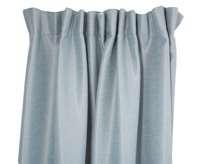 Gardinen har veckband upptill och sydd overlocksöm nedtill. Sydda i mörkläggande mjukt tyg, även kallad sun-out. Sun-out är en tekninsk väv i tre skikt med ett spärrskikt i mitten. Stänger ute solens strålar upp till 95%. Tyget har samma nyans på både fram och baksida, baksidan är mer melerad. Säljes i förpackning om 1st.