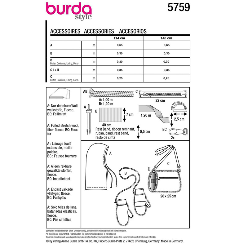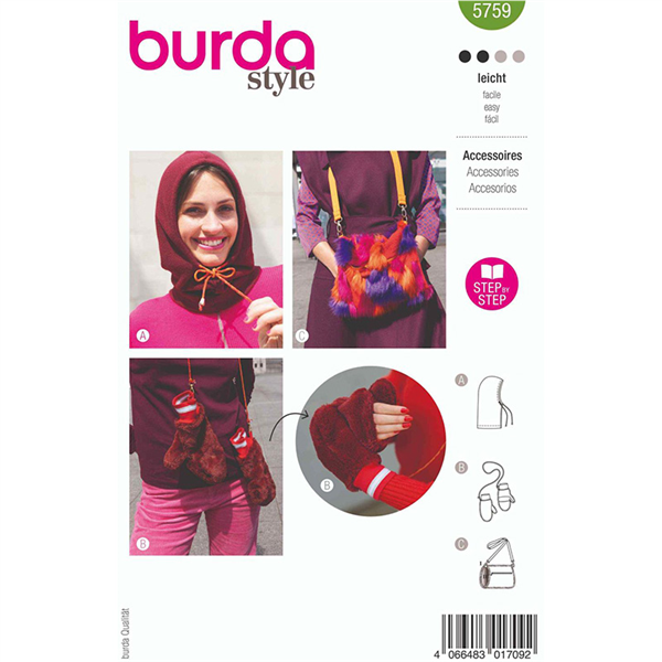 Enkelt mönster av accessoarer för kyliga dagar i 3 olika modeller! Ett mönster för en balaklava, ett mönster för en väska samt ett mönster för ett par vantar. Välj och vraka bland fina tyger som Pälsimitationer, Ulltyger, Fleece eller något annat varmt tyg för att skapa just din unika look!