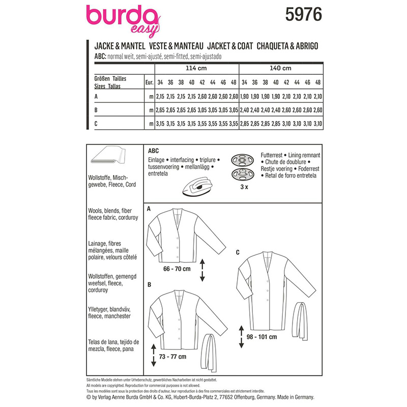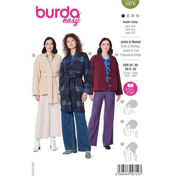 Snyggt mönster på jacka i 3 varianter! Välj och vraka bland fina tyger som Pälsimitationer, Ulltyger, Softshell, Manchester och andra tyger för att skapa just din unika look!