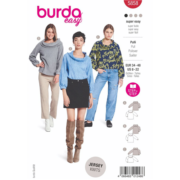 Fint mönster på en mjuk Pullovertröja i tre olika modeller! Perfekt att sy i stickadeModetyger, Ulltyger, Joggingtyger med mera för att skapa just din unika look.