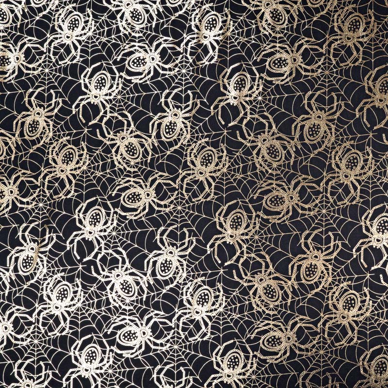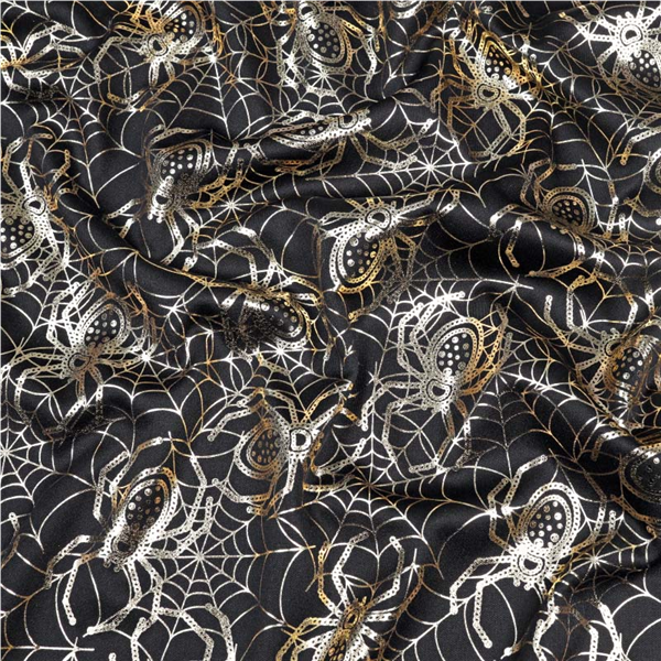 Mönstrat Modetyg med generös stretch och ett tryckt och skimrande halloweeninspirerat mönster. Tyget har en blank yta och upplevs väldigt följsam och behaglig mot huden. Passar utmärkt till klädsömnad som tröjor, klänningar, kjolar, byxor, skjortor, utklädnader och mycket mer!