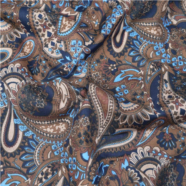 En tunn och följsam Bomullspoplin i 100% bomull! Tyget har ett tryckt paisleymönster på rätsidan. Bomullstyget är tätvävt och helt i naturmaterial vilket gör att tyget andas och känns skönt och luftigt. Passar utmärkt till sömnad av lapptäcken, blusar, skjortor, klänningar, sängkläder och mycket mer!