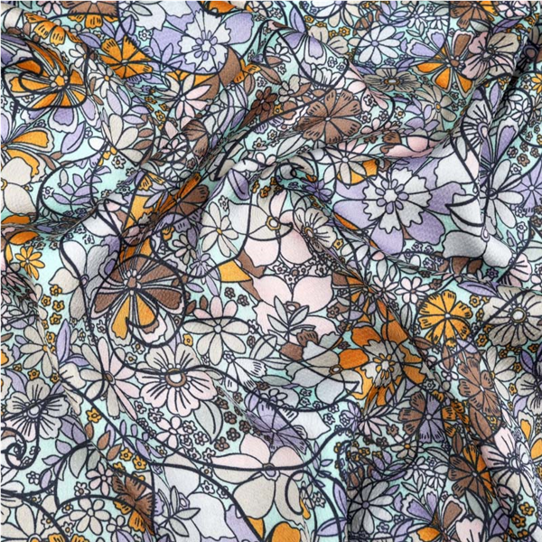 Ett tunt Modetyg med ett tryckt vackert mönster. Klädtyget upplevs otroligt böljande, tunt och följsamt. Tyget har en lätt kreppad yta och ett diskret skimmer. Passar perfekt till sömnad av blusar, klänningar, skjortor, kjolar, byxor med mera.