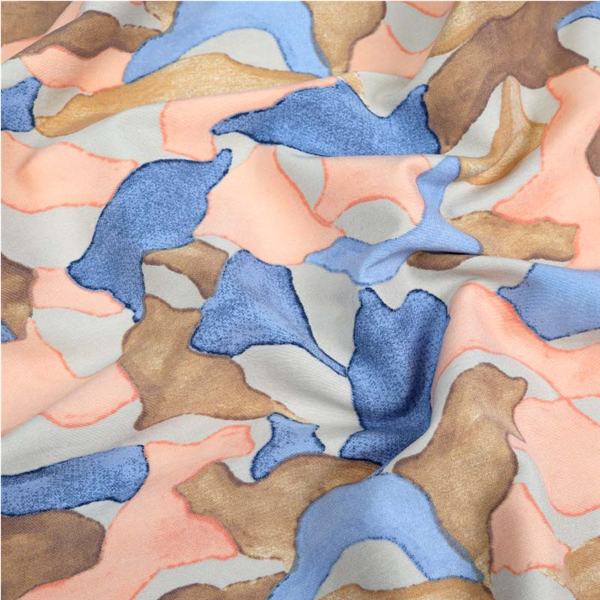 En tunn och följsam Viscosemix med generös stretch. Klädtyget upplevs både stadigt och följsamt, med ett tryckt mönster. Passar perfekt till sömnad av blusar, klänningar, skjortor, kjolar, byxor med mera.