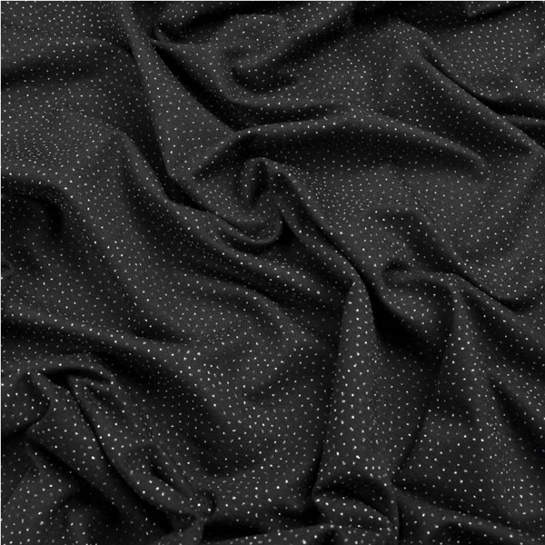 Ett otroligt mjukt och stretchigt Trikåtyg med glittriga prickar. Passar utmärkt till att sy blusar, klänningar, jumpsuits, kjolar, tröjor och mycket mer!
