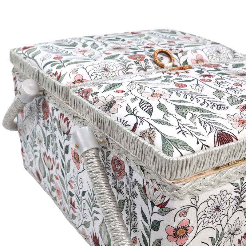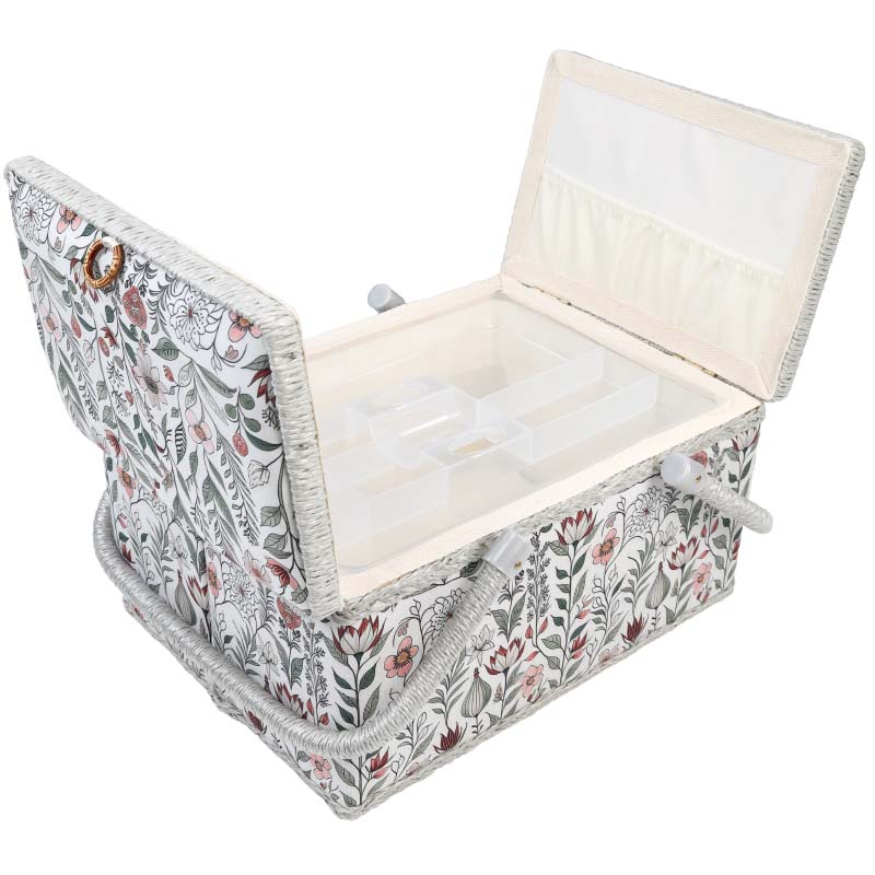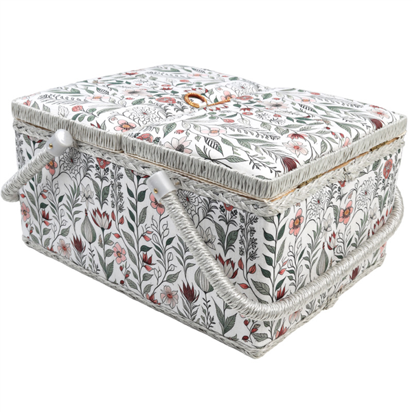 Ett fint och praktiskt Syskrin i måtten 30,5x23x19cm. Ett syskrin är den perfekta förvaringen för mindre syprojekt, nålar, trådar och andra praktiska tillbehör. Syskrinet har en fastsydd nåldyna och fickor på insidan på locken, och en uttagbar plastbehållare med mindre fack.