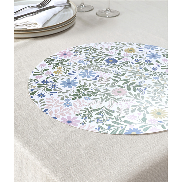 En mönstrad Bordstablett med blommigt motiv i plast. En snygg detalj vid dukningen och som samtidigt skyddar köksbordet och duken från spill. Rengörs enkelt genom att torka av med fuktig trasa!