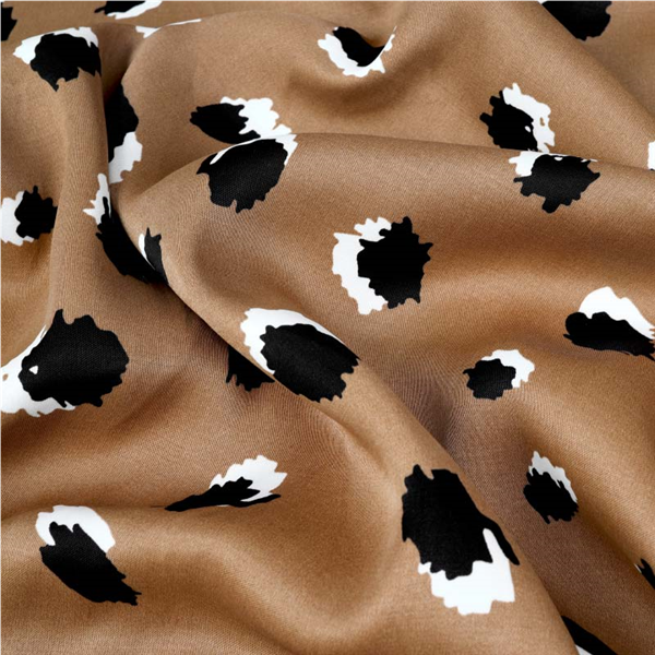 Ett tunt och följsamt Modetyg i 100% viscose. Viscosen upplevs otroligt böljande, tunn och följsam, med ett tryckt mönster. Tyget har en blank, skimrande yta likt satin vilket ger en lyxig känsla. Passar perfekt till sömnad av blusar, klänningar, skjortor, kjolar, byxor med mera.